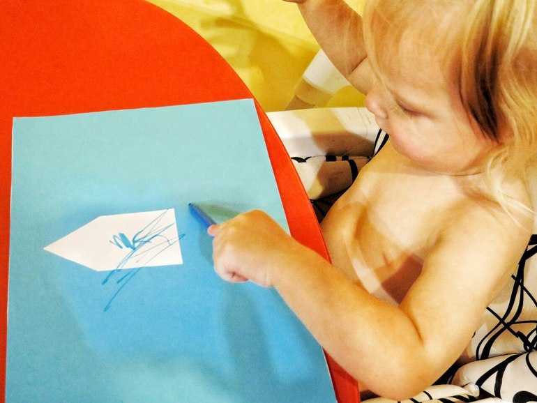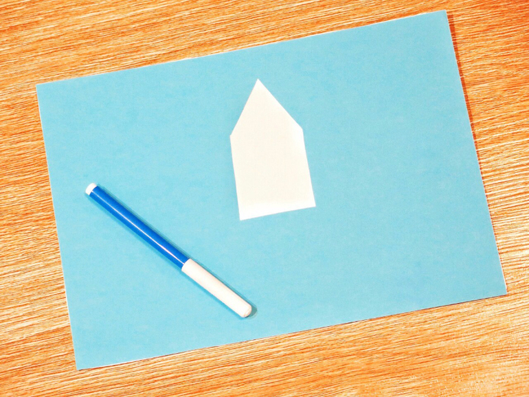 Доче то же нашли занятие: предложила ей раскрасить фломастером вот такой домик, по принципу обычных пособий по обучению этому хитрому делу. Вырезала в голубом листочке силуэт домика и приклеила на оборотную часть белый лист.