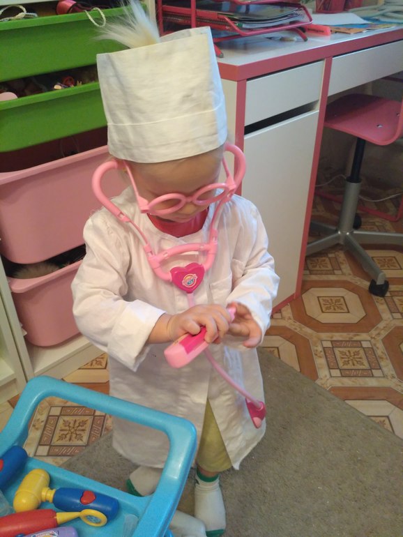 Стетоскоп удобный, не тугой, хорошо держится в ушах как ребёнка, так и взрослого. Он должен быть с подсветкой и звуком бьющегося сердца, но у нас не работает, возможно надо поменять батарейку. Это пожалуй единственный неприятный момент, но ребёнку и так интересно.