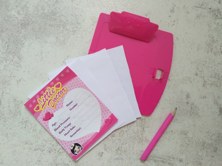 Ну и последнее это планшет доктора, он здесь не просто для галочки, а его действительно можно использовать. Зажим работает, можно дополнять листиками и Юный доктор будет по настоящему выписывать рецепт: