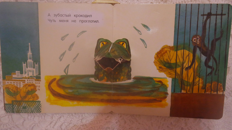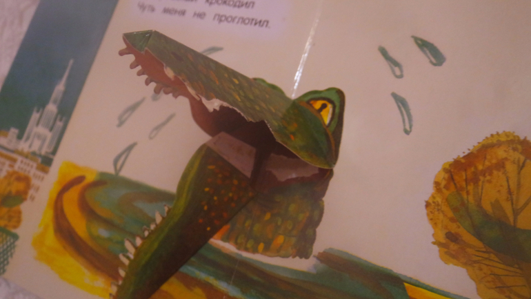 На последней странице еще один игровой элемент: кусающийся крокодил!!! Идея -супер! Но исполнение грустное....При первом же прочтение у нас отклеилась нижняя часть пасти...я приклеила, но потом отклеилось это же место, но теперь виднеется картон....Зубки тоже рвутся...Весь крокодил сделан из обычного тонкого картона...Очень жаль , что такие красивые игровые элементы очень хрупкие....