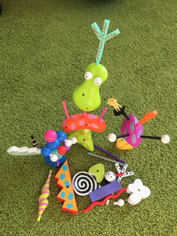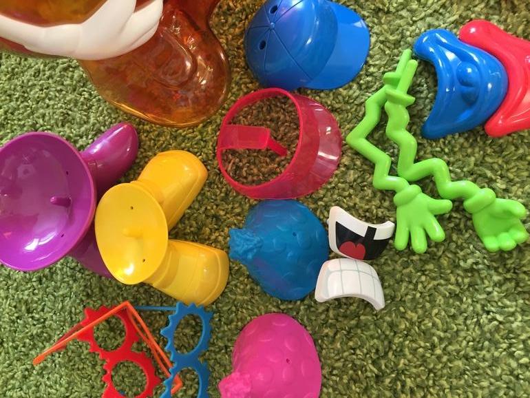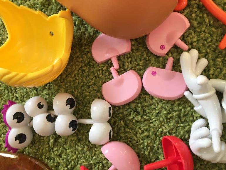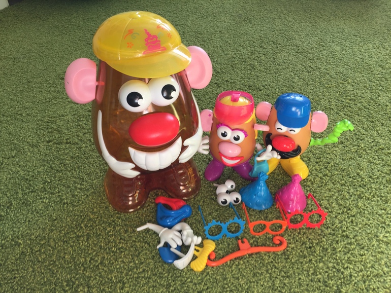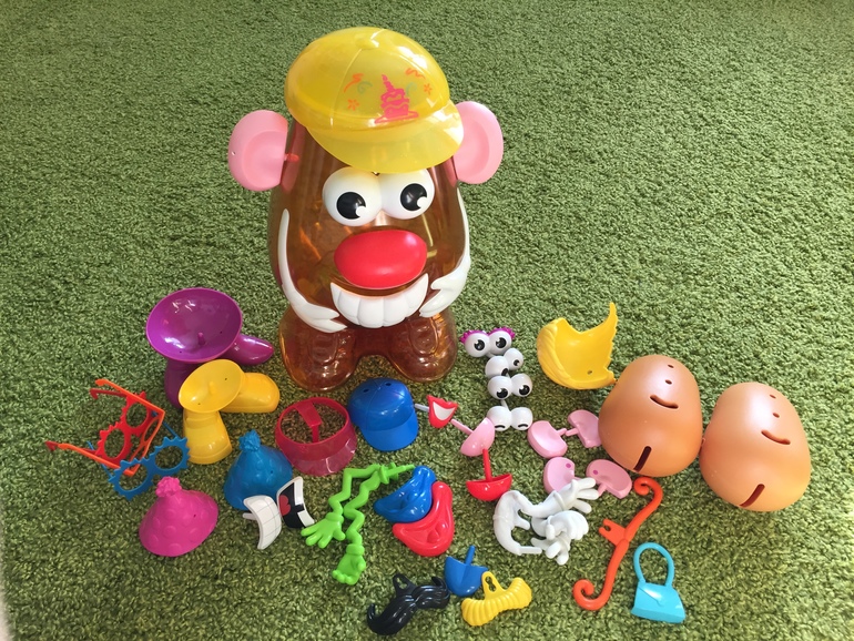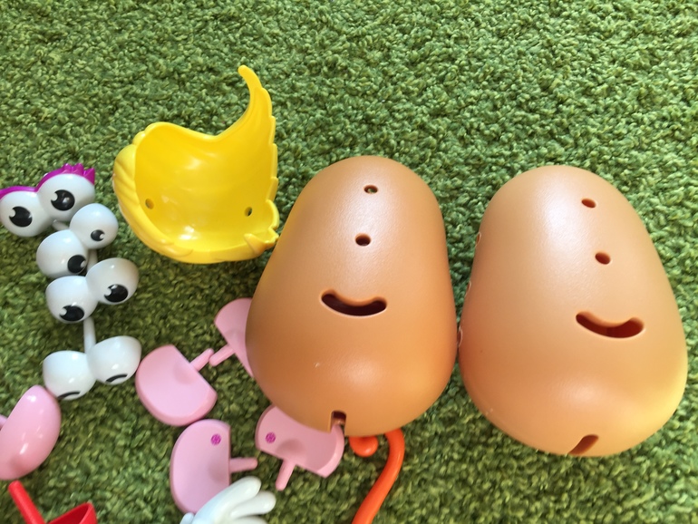 Первым у нас появился мистер картошка. Он до сих пор главный фаворит. Собираем, как произвольно, так и по заданию. Делаю фото на телефон в собранном мною виде прошу повторить. Ну и конечно мы их кормим, укладываем спать и купаем.
