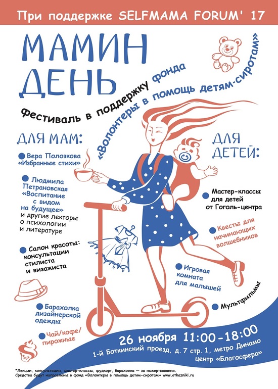 Куда пойти с ребенком? (Все о досуге с ребенком и семьей)26 ноября - это международный праздник, День матери. Мы предлагаем взрослым в этот день отдохнуть и посвятить время себе, а дети в это время будут участвовать в захватывающих квестах и мастерских по театральному искусству. Средства, собранные в ходе фестиваля, будут направлены в фонд «Волонтеры в помощь детям-сиротам» ().