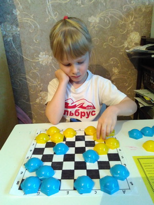 4. Ну, и когда всё было готово, мы приступили к игре. Правила, как и рекомендовалось, ввожу постепенно в процессе игры. Дочке понравилась игра в шашки, уже сама, без подсказки, начинает видеть шашку, которую «можно съесть».