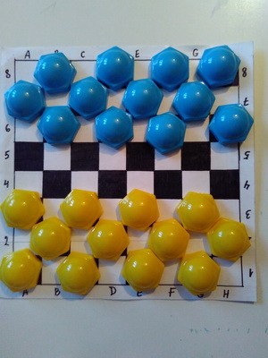 2)Игра ведётся на стандартной шахматной доске 8 х 8, повёрнутой так, чтобы по горизонтали были буквы, а по вертикали - цифры.