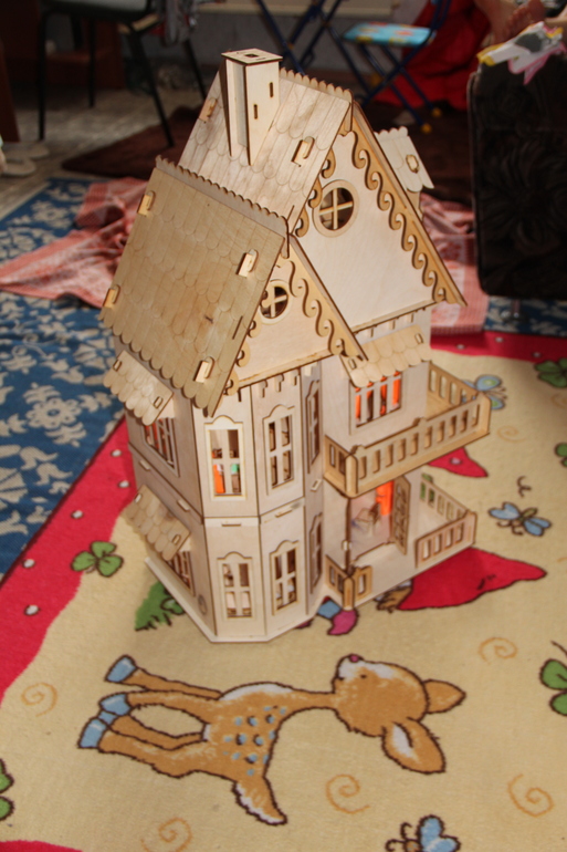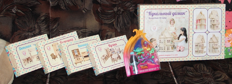 Домик сборный. Плюс еще мебель взяли. Покупали все в простом магазине игрушек "Рич Фэмили". Цена за домик около 1,5 тыс., каждый набор около 200-250 рублей - точнее не вспомню.