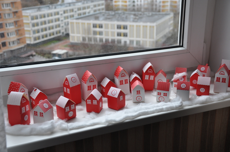 Все по тем же причинам, адвент у нас в этом году снова полуфабрикатный: домики куплены в Икее, шаблоны заданий взяты вот тут + пару дней продумывания концепции и покупки подарков + один вечер собирания и наполнения домиков и вуаля!:)