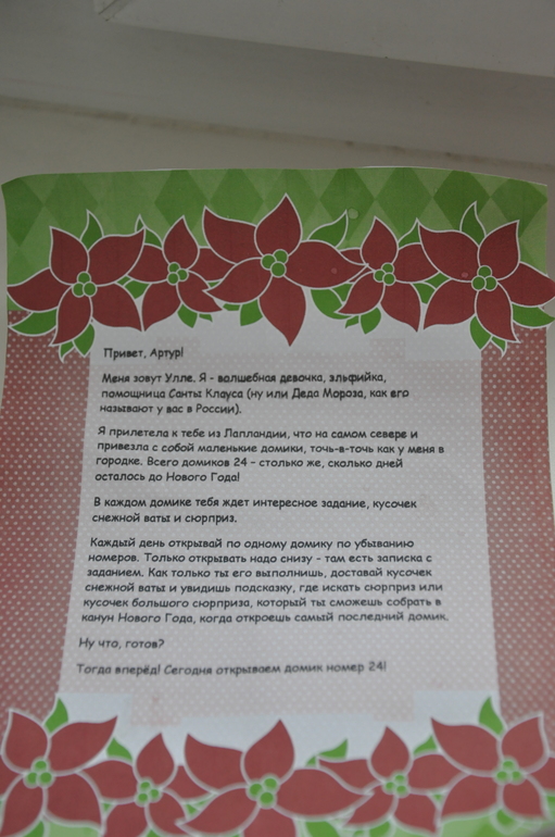 В соответсвии с посланием, иногда, в самом домике, вместо подсказки, где искать сюрприз, Артур находит части большого сюрприза, которые бережно собираются и хранятся до 31го декабря (что именно это будет, Артурио пока не догадывается):