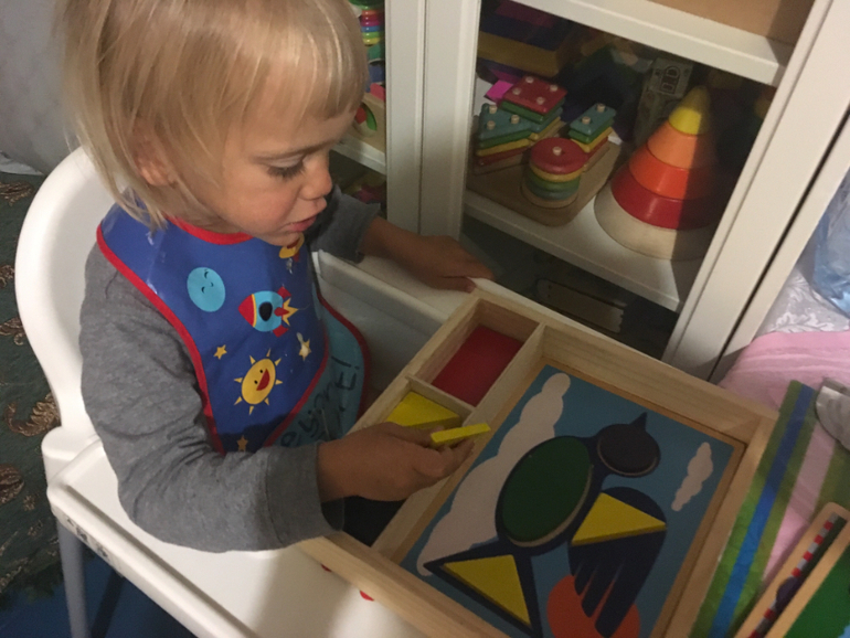 Ох, уж эти блоки Дьенеша! Та самая картинка, на которой не хватает деталек - кто- то уже об этом писал. Пробовала заменить другими кругами - не понравилось. Зато с удовольствием по просьбе отдал мне все толстые, тонкие, ну и от остальных избавился с большой радостью))) поняла, что это оптимальный вид сортировки для нас - верни мне все красные, все большие и т.д. Ура! Игра закончена.