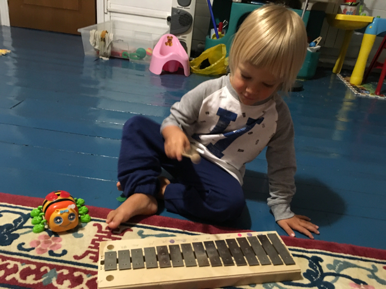 Пытаемся проигрывать песенки по Железнову из одной и двух ноток. Вот здесь у нас жужжит бегающий жук. Принцип такой - сыграна песенка, приходит забавная игрушка. Пока не вошло в систему, делаем спонтанно и по желанию.