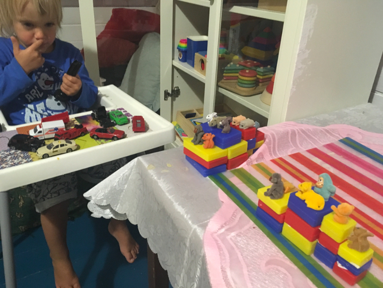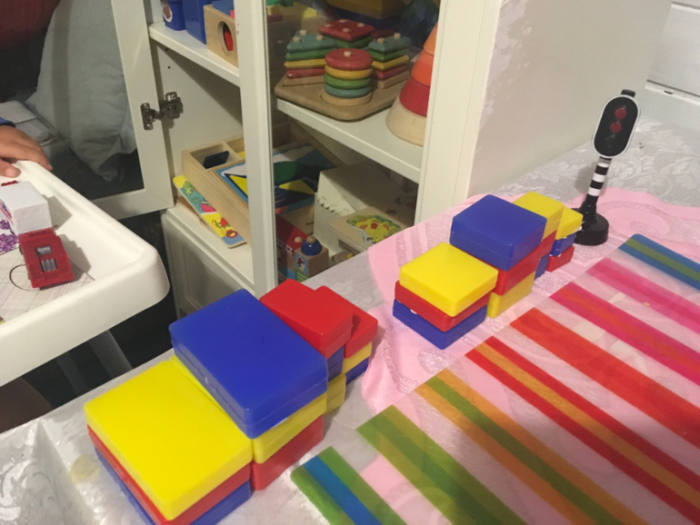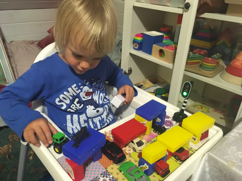 Здесь строили гаражи. Дала машинки и светофор раньше времени. отвлекся. Развивающего эффекта ноль, зато поиграли на славу. Интерес только к содержимому гаражей и светофору.