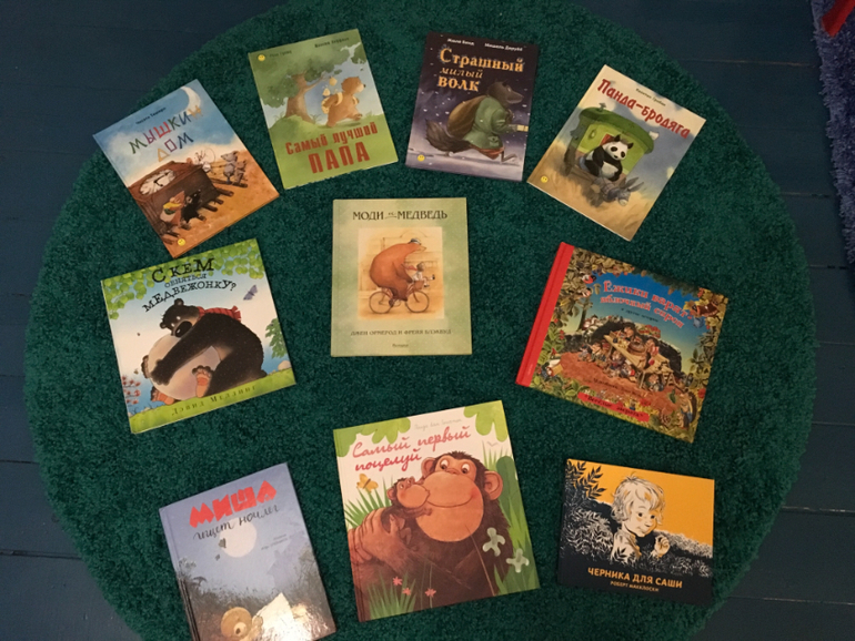 Из этих переводных запомнились Мышкин дом, Волк и Панда, ну и черника. Миша, ищущий ночлег, конечно, беспободобным оформлением Олейникова. Моди - немного странная книжка, долго за ней гонялась, так и не поняла зачем. Ежики с сиропом - чудесные иллюстрации в стиле Виммельбухов. Поцелуй и объятия - идентичны по идее и содержанию.