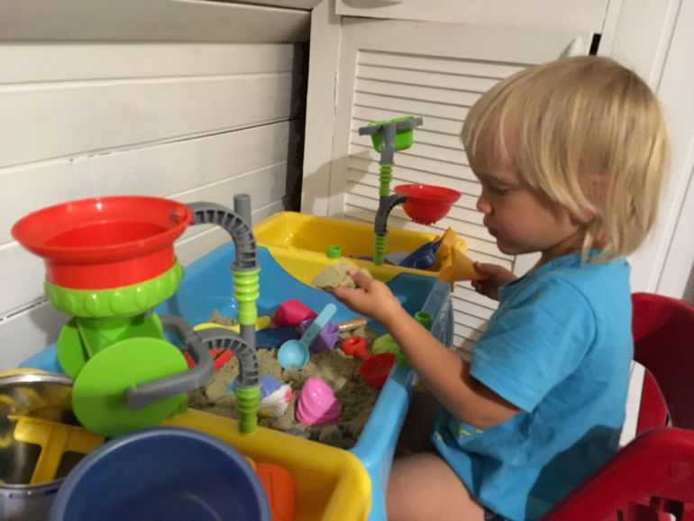 На волне внезапно возникшей любви к песку, обзавелись такой вот песочницей. Отличная штука. Если купить обычный речной песок, можно играть с водой, чем мы и займёмся в ближайшем будущем. В любом случае играть предпочитает в компании, поэтому открываю все новые и новые наборы формочек, которые, кажется, никогда не кончатся благодаря стараниям вот этой девушки .