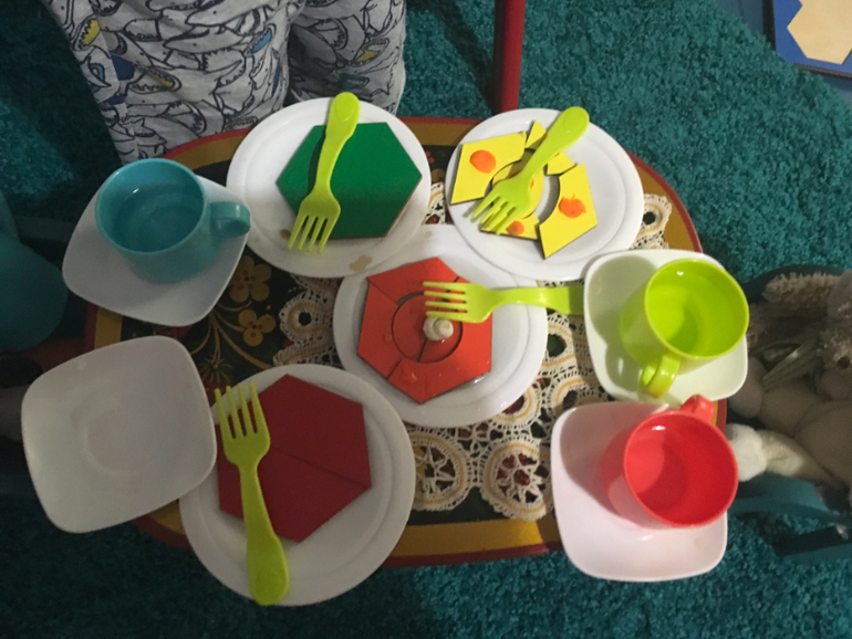 Что ещё конструировали? Конечно, торты с последующим чаепитием. Отработали треугольники, точнее как с ними манипулировать вот на этом пособии - никак не мог с ними разобраться. Пришлось озвучить такие понятия, как прямой угол, катет и гипотенуза))) был польщен) легко показывает вышеназванное на фигуре.