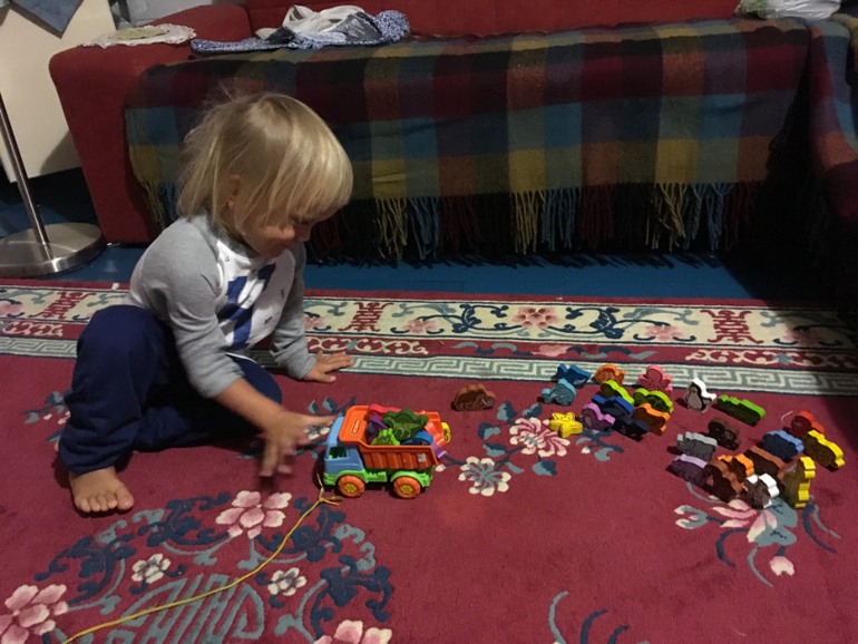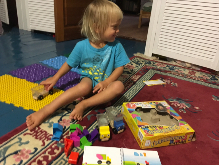 Все время рвётся к шкафу с моими учебными материалами и требует раритетные машинки, которые я выдаю только во время развивающих игр. Чтобы переключить внимание Открыла новую головоломку - Грузовички.