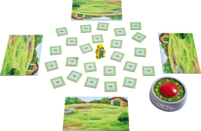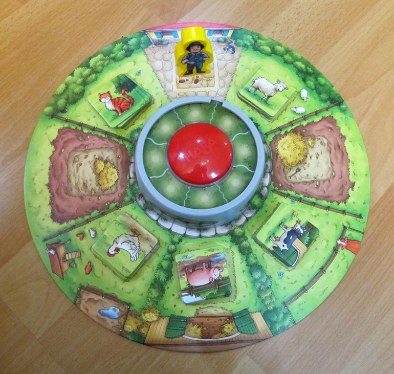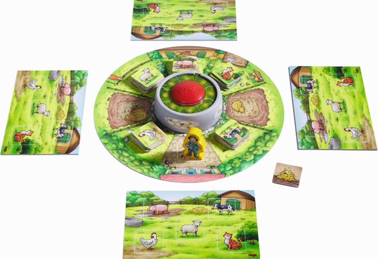 В сарае всегда полно дел. Каждое утро фермер по имени Бруно должен отводить своих животных на пастбище. Но где же ягнята, коровы, куры, свинья и кошки прячутся? У Вас есть волшебная кнопка, нажав на нее, Вы сможете услышать голоса разных животных. Как хрюкает свинья? Или Вы узнали - это промяукал котенок? Сможете ли Вы быстро найти животных по их голосам? Кто из игроков сможет быстрее всех отвести своих животных на пастбище?