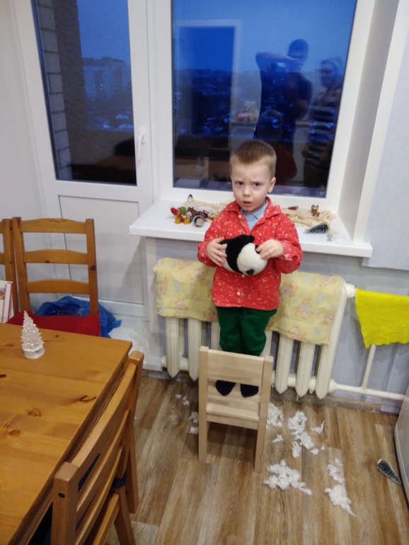Наивно было с моей стороны ожидать чего-то иного от ребенка для которого сенсорная коробка с горохом- это значит салют из гороха!) Сема у нас очень большой фантазер, у него лошадь тут же помчалась и упала с обрыва (с подоконника), подарки подобрал ветер и унес их в домик Деда мороза, да с такой силой, что дом рухнул. Чувствую новый режиссер фильмов-триллеров подрастает. Правда день на 5й ему эта игра наскучила и он перестал к ней подходить. Буду ли делать ещё? Обязательно буду!