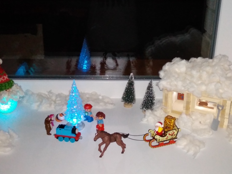 Домик из конструктора-бревнышек, ёлки, лошадь и санки из май-шоп, дед мороз от Киндера, светящаяся ёлка из фикс-прайс, подарки от новогодних украшений, вата из аптеки) Покупала все с лета.