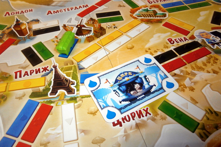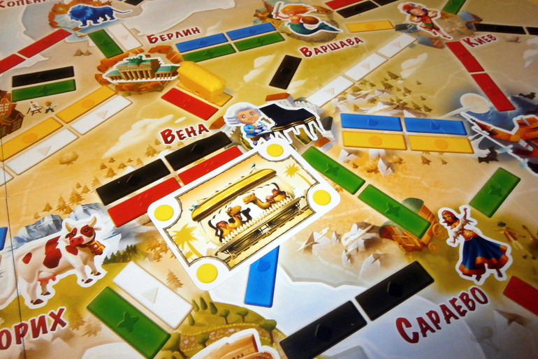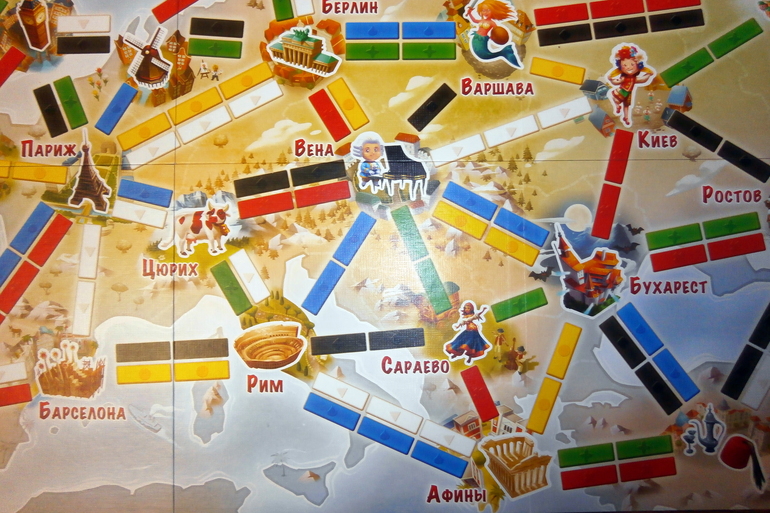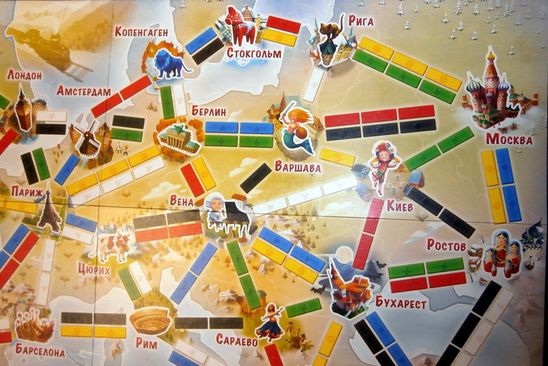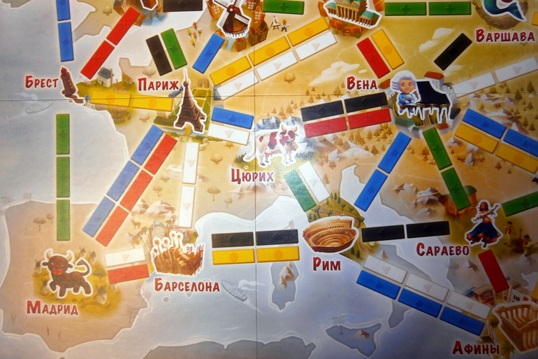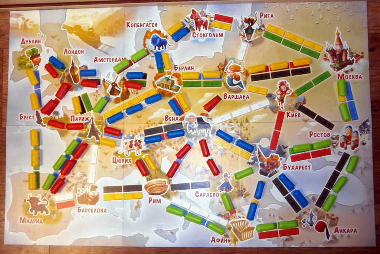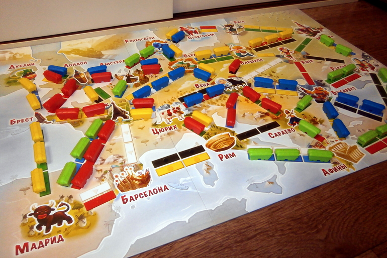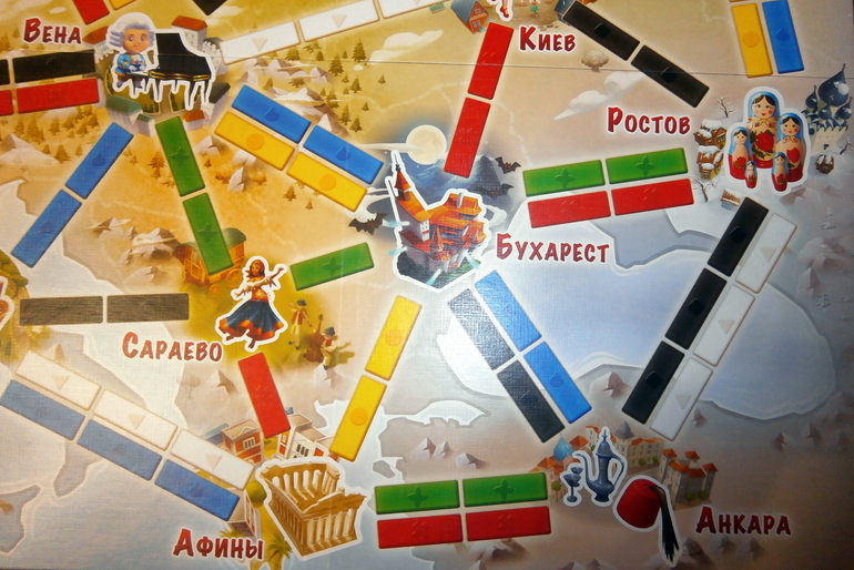 Бонусная карта "С востока на запад". Если вы создали непрерывную цепочку вагончиков своего цвета между одним из городов на востоке (Москва, Ростов, Анкара) и одним из городов на западе (Дублин, Брест, Мадрид), сообщите об этом другим игрокам и возьмите одну бонусную карту.