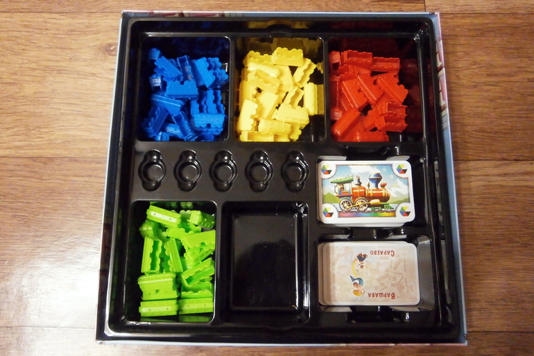 Игра для 2-4 игроков возраст +6 лет. В составе игровое поле, 80 вагончиков (и несколько запасных) четырех цветов (синий, зеленый, красный, желтый), 72 карты составов, 32 карты маршрутов, 4 бонусные карты "С востока на запад" и 1 золотой билет.