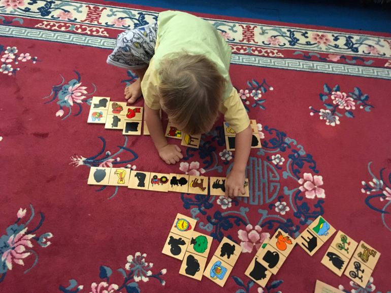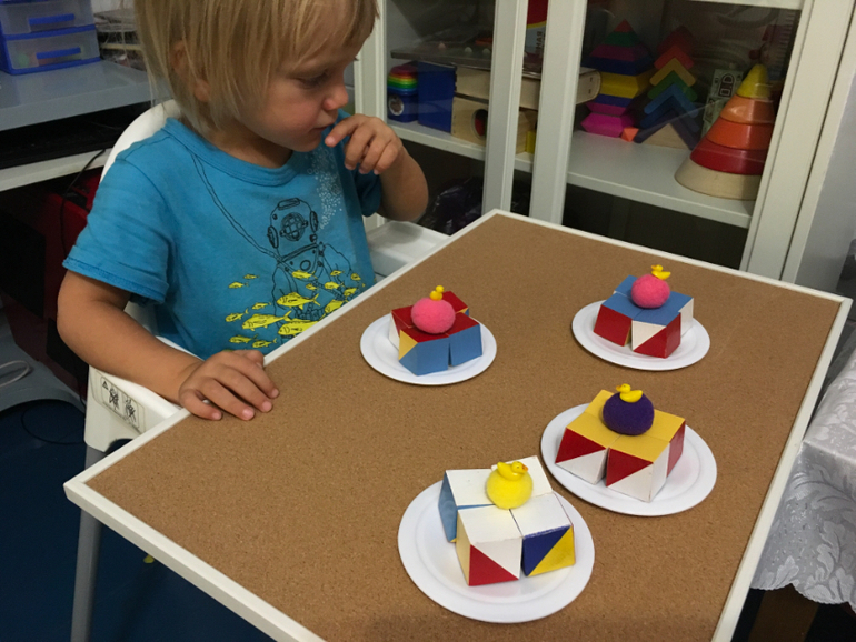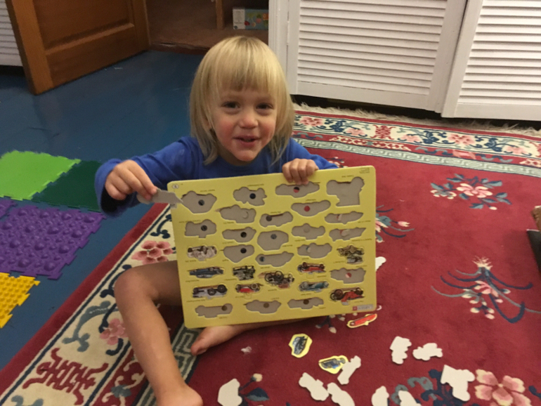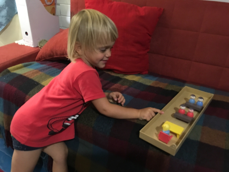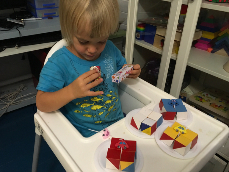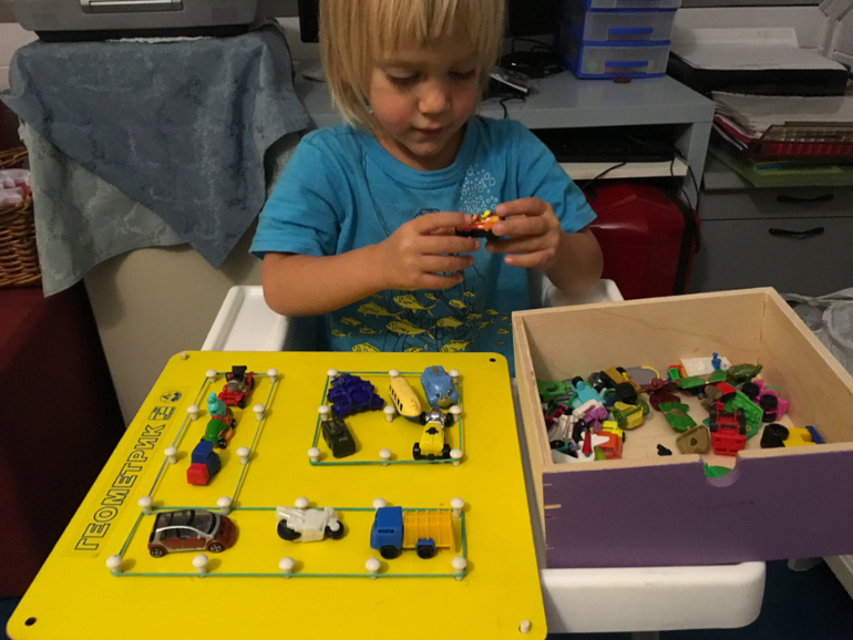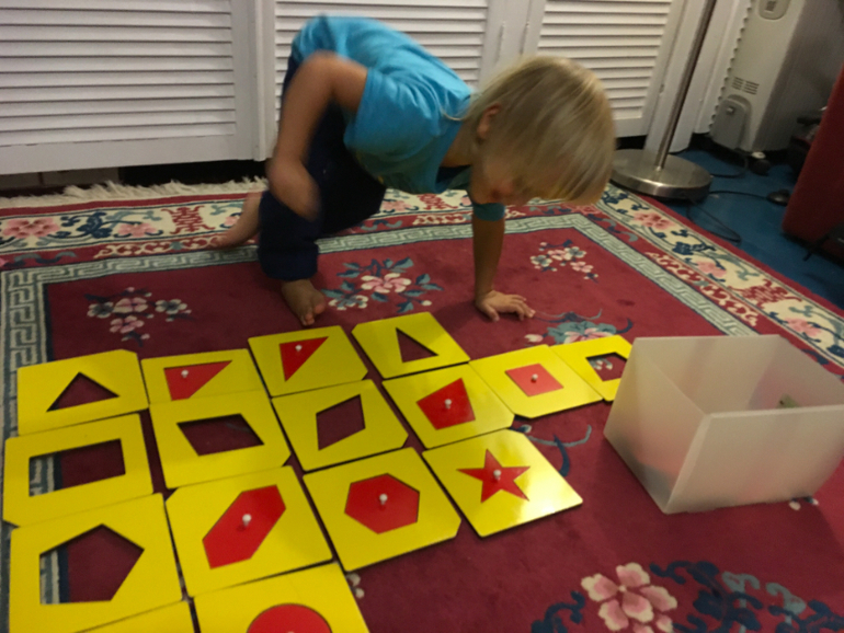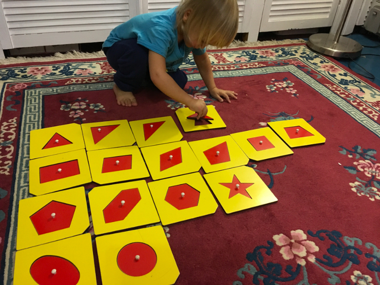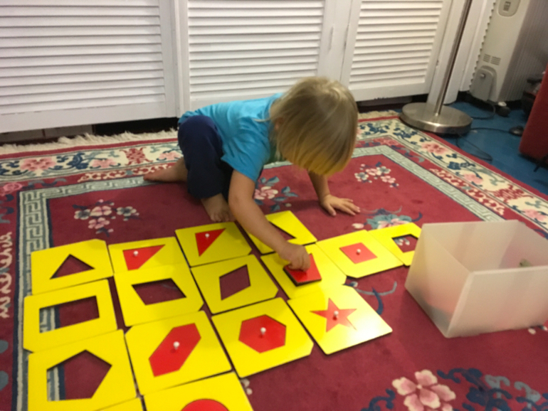 С рамками Монтессори справился на раз-два-три. Пытались сортировать вкладыши по количеству углов, учились различать треугольники, ну и познакомились с новыми фигурами - дельтоид, параллелограмм, пяти и шестиугольник. Ранее выученные находит правильно.