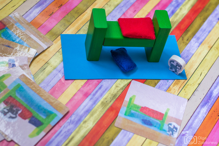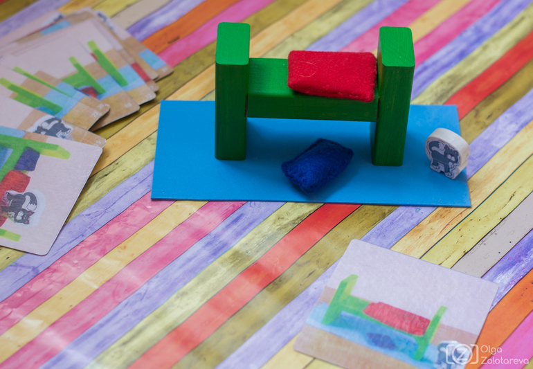 По карточке собирает, если я веду процесс: "где одеяльце нарисовано, посмотри? Правильно. А теперь положи подушку так же, как на картинке. Так? Нет, смотри еще раз. Вот да, отлично!" Т.е. сама я не собираю обстановку, но всё время начеку)) Иначе сразу же начинается вольное творчество, сюжетные игры и повторение моей интонации "Праааавильно, да!", вне зависимости от того, совпало ли с картинкой расположение хотя бы одного предмета. Ну, так и должно быть, ведь если логическая игра даётся легко, она бесполезна. Главное, интерес есть. Будем играть далее!