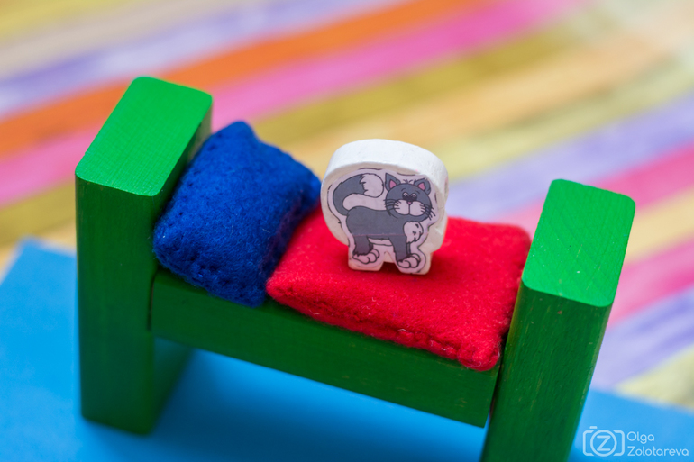 Для кровати стоило бы подобрать подходящие дощечки, но я принципиально решила не покупать ничего здесь, и позаимствовала плашки от деревянного конструктора, склеив и покрасив их акриловой краской. Коврик - фоамиан. Подушка и одеяльце из фетра. Для кота взяла одну из бусин дочкиной шнуровки, где бусины с изображениями животных. Маловата немного, но по форме хорошо подошла. На покрашенную в белый цвет бусину наклеила изображение кота, покрыла лаком. Кубик пока не делала.