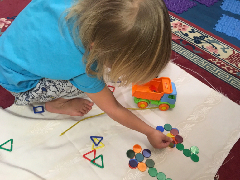 Все игры теперь проводим на ковре в движении. Разложил машинки по цветам, пересчитали, сравнили количество, выяснили чем похожи и отличаются, нашли одинаковые-разные.