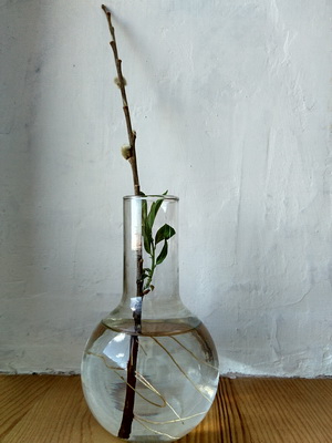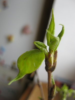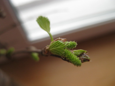 В 2016 году начались первые наблюдения за изменением растений с приходом весны в домашних условиях. Городские службы как раз делали коронирование деревьев, и на земле лежало много спиленных веток. Мы принесли домой несколько из них и поставили в воду. (Ветки с деревьев ломать не разрешаю). К концу марта на веточках было много молодых зелёных листочков.