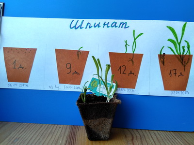 Ещё в этом году мы попробовали для наглядности зарисовывать изменения роста растений (а не только фотографировать их). Рисовала, конечно, я, зато дочка наблюдала и контролировала, чтобы все изменения были запечатлены. В магазине «Лента» проходила акция «плантация» и мы получили несколько торфяных горшочков с семенами. Вот так вырос шпинат. (Потом его съела наша кошка, и дальнейшие наблюдения не состоялись).