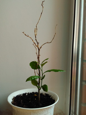 К слову, лимоны мы начали выращивать ещё и потому, что посаженный нами в 2016 году цитрус к концу осени-началу зимы сбросил все листья и начал засыхать. Я не сдавалась, поливала его, ждала, что оживёт. И вот, Ура! В середине марта 2018 года появился зелёный росточек! Я была просто счастлива! Дочка каждый день подходила и смотрела на сколько росток подрос. Очень надеюсь, что растение продолжит жить у нас в добром здравии и будет радовать своей красотой.