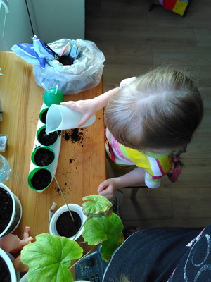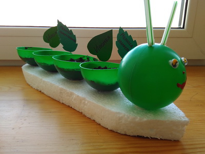 «Огород на окне» выращивают традиционно в детских садах и в нашей группе в частности. В прошлом году в детский сад просили приносить семена (укроп, петрушка, салат). Посадками и уходом в основном занималась воспитатель. В этом году попросили принести готовые посадки в каком-нибудь оформлении. Мы с дочкой посадили Ипомею и Мелиссу лекарственную вот в такую клумбу-гусеницу, сделанную из шариков от сухого бассейна (семена остались с прошлого года). За ростом мелиссы и ипомеи теперь будет наблюдать дочка и её группа.