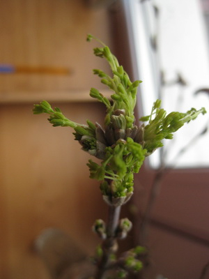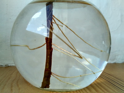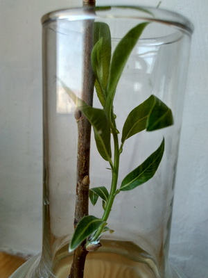 На окошко в вазочку поставили несколько веточек, одна из них дала неплохие корни и молодой росток.