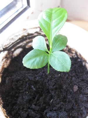 Неожиданно к периоду наблюдения присоединилось какое-то цитрусовое растение из случайно посаженой косточки. Сколько косточка пролежала в земле, неизвестно, но вот решила взойти. Мы с дочкой с удовольствием смотрели, как появляются листочки, как растение тянется к солнышку, становится выше, пышнее, красивее. Ухаживали за ним.