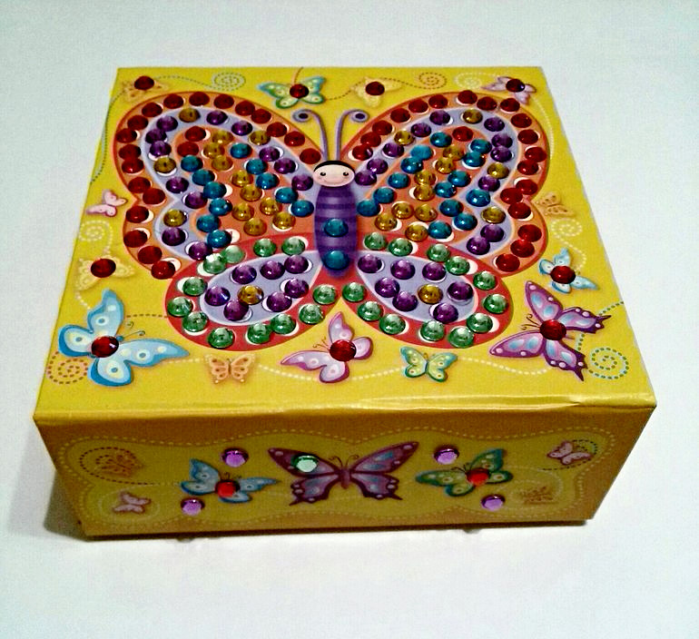 Сама шкатулка небольшая из толстого картона, мы ее клеили на клей, потому что входящая в набор самоклеящаяся лента не держала и бока все время разваливались. А вот клеить стразы прямо ювелирная работа. Их очень много и нужно запастись терпением, мой ребенок не отличается любовь к монотонной деятельности, поэтому через 15 минут она была готова убежать. Пришлось клеить вместе. Делать это нужно очень аккуратно, стразик нужно перенести на коробку, желательно, не касаясь клеевого слоя, иначе он остается на руках и клеить уже придется на клей. Страз в наборе больше, чем нужно, поэтому можно не бояться, если парочка потеряется. Места их крепления обозначены номерами, которым соответствует определенный цвет. Шкатулка служит нам уже несколько месяцев, ни разу не разваливалась, закрывается на магнитную ленту плотно. Можно спокойно вертеть в руках с содержимым внутри, ничего не вывалится. Иногда отваливаются стразики. Те, что находим, приклеиваем обратно.