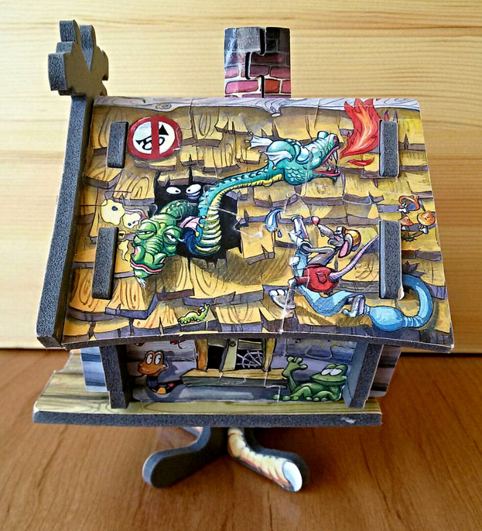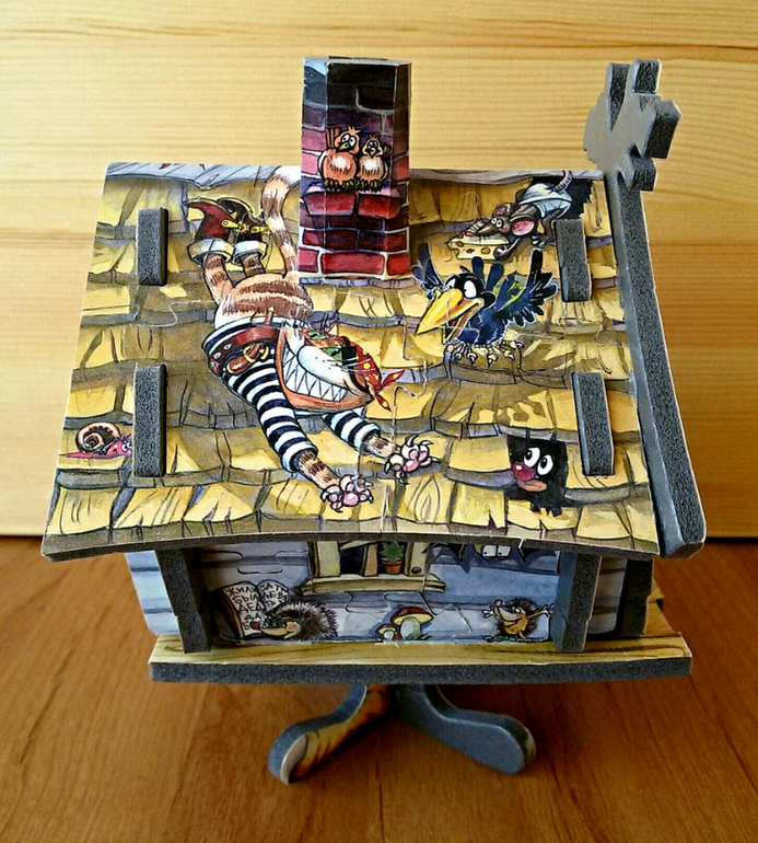 Этот замечательный объемный пазл нам принес папа. Он же его с дочкой собирал. Уж не знаю сколько тут деталей, зато какая красота получилась. Эта избушка у нас участвует во все домашних театрах. Дети с удовольствием с ней играют и рассматривают колоритных обитателей. Сделан пазл из картона, нанесенного на мягкий полимер. Форму держит хорошо, у нас разваливался только, когда мелкий до него добирался и разбирал. Когда папе надоело в очередной раз его собирать, он его склеил. На фото избушке уже больше года.