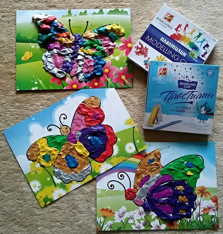 А потом к нам пришли дочкины подружки и тоже с удовольствием сделали своих бабочек. У нас как раз осталось три штуки, так что хватило всем. В этот раз мы достали пластилин "Престиж" с двумя брусочками с эффектом «металлик» золото и серебро.