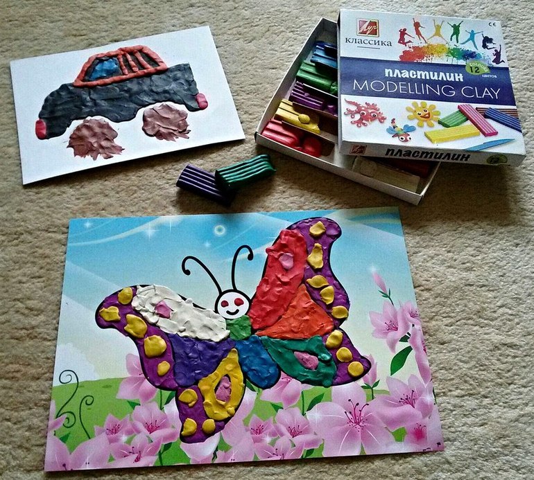 Мы его немного подержали на батареи и он отлично размазывался. С этим справился даже двухлетний ребенок. Пока дочка делала бабочку, мы с сыном осваивали круги, а потом перешли на более серьезное творчество и сделали машинку. Колеса сын делал сам, а также помогал мне замазывать черный кузов.