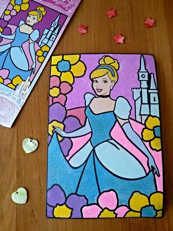 Получилась насыщенная картинка с любимой принцессой. Оставшийся песок мы ссыпаем в различные баночки и бутылочки, чтобы в дальнейшем использовать в различных поделках в качестве фона или других более мелких элементах.