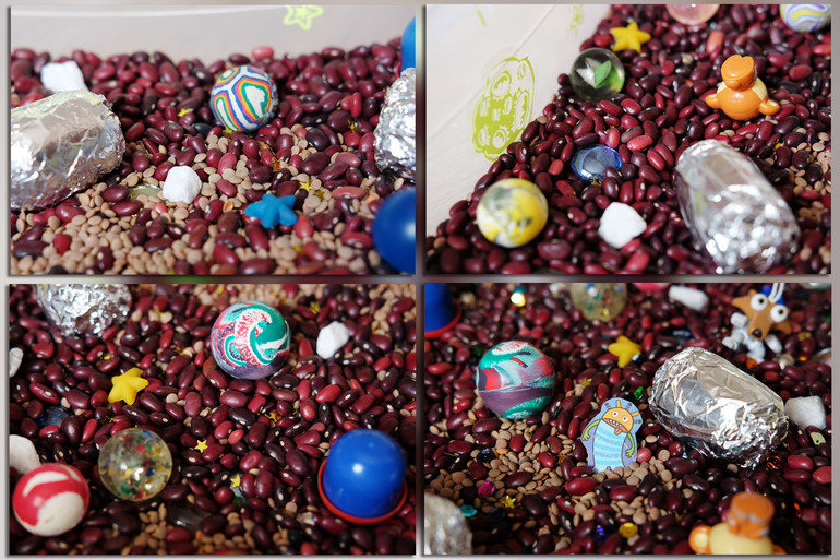 Наполнение: фасоль и чечевица. Детали: камни, стекляшки, звезды из пластилина (который засыхает на воздухе), металлические шарики и другое...