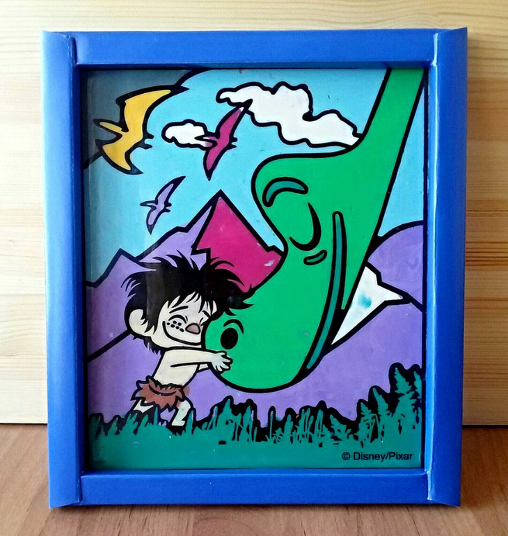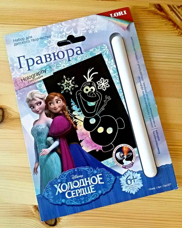 Гравюра - теперь один из самых любимых видов творчества у дочки. До этого мы баловались маленькими и вот, наконец-то, перешли на большие. Ребенок заявил, что хочет собрать всю коллекцию, которая нарисована на обратной стороне упаковки. А пока мы ее рассматривали, выяснили, что она оказывается служит рамкой для готовой работы. Нужно только аккуратно заправить уголки гравюры в четыре прорези-держателя, поставить на полочку и любоваться.