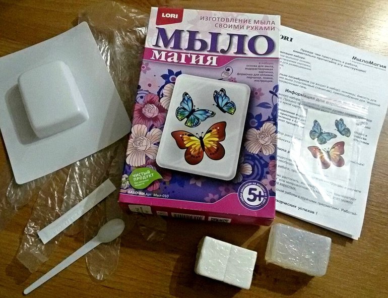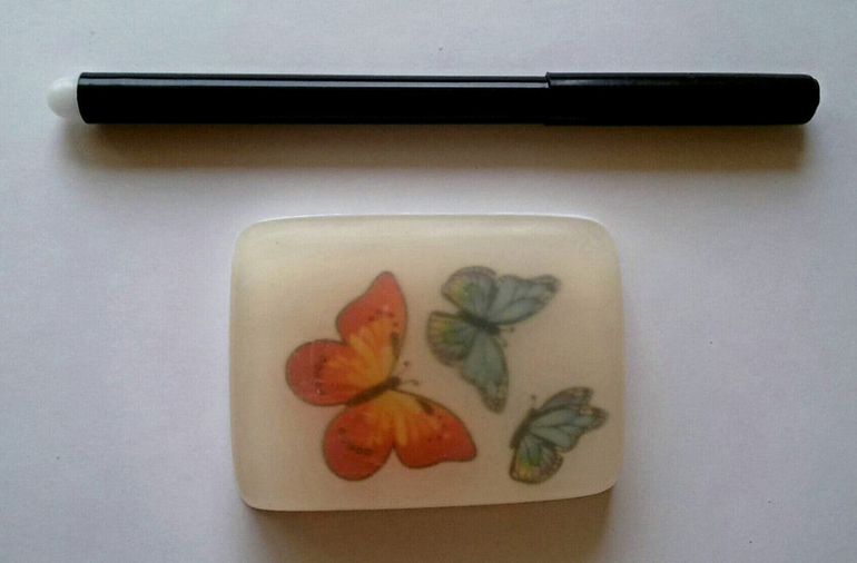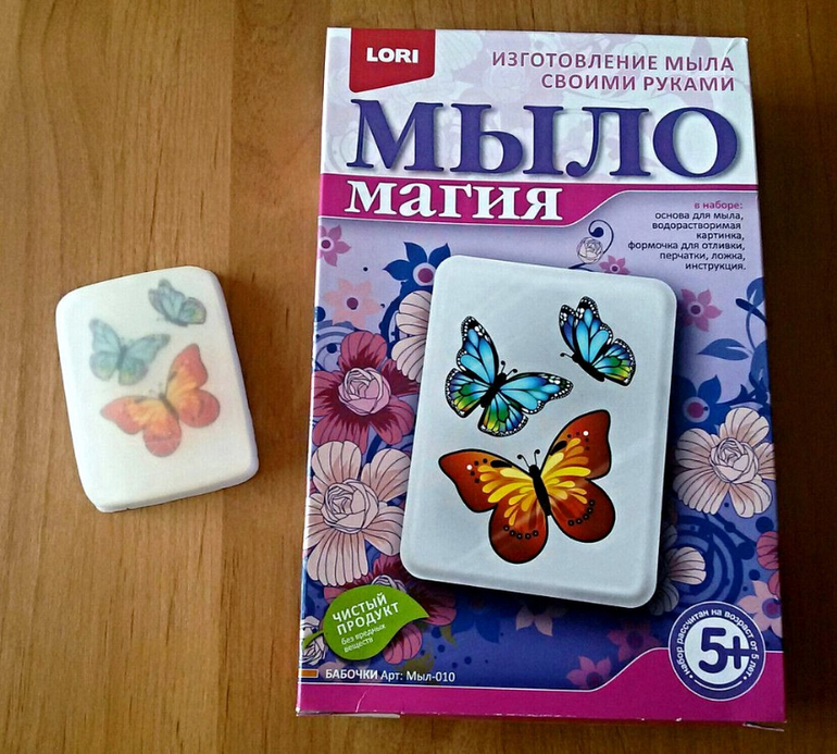 Рисунок получается не очень яркий, потому что сверху заливается мутной основой. Застывает все быстро. Дочке понравилось убирать пузырьки зубочисткой и мыть руки готовым мылом. Бабочки полностью растворяются, но вот мылиться мыло плохо.