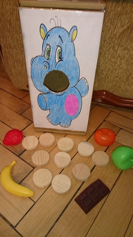 "Кормим" животных всем, чем есть и пластмассовыми овощами и фруктами, и кусочками бумаги, и игрушки, которые проходят через отверстие, и даже деревянными кружочками. Эти деревянные кружочки называем "Печенье". Девочки может вы подскажете как эти деревянные кружочки украсить ? Может покрасить в разные цвета или наклеить картинки с едой?