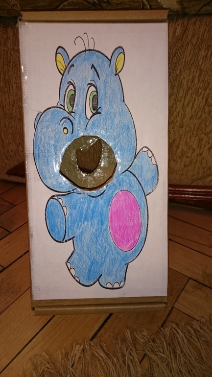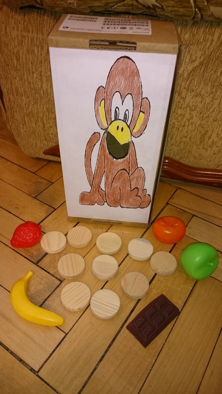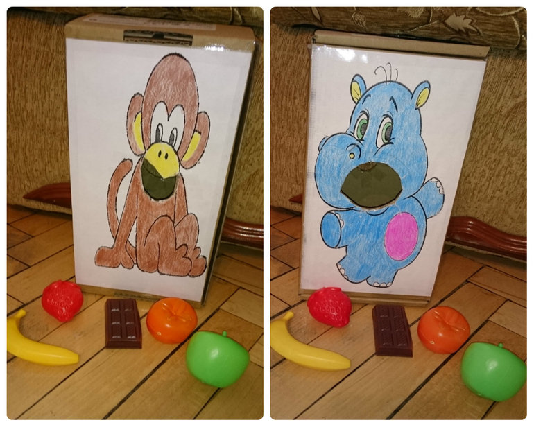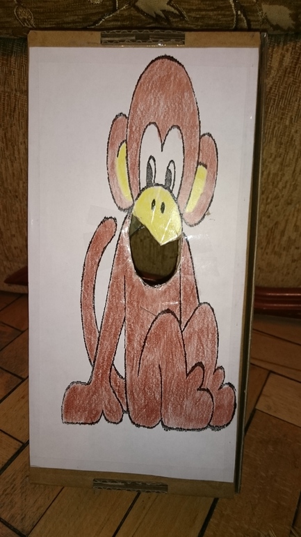 Коробку я использовала с двух сторон. С одной стороны отверстие побольше, оно досталось бегемоту, с другой по-меньше, а значит и посложнее будет накормить обезьянку.