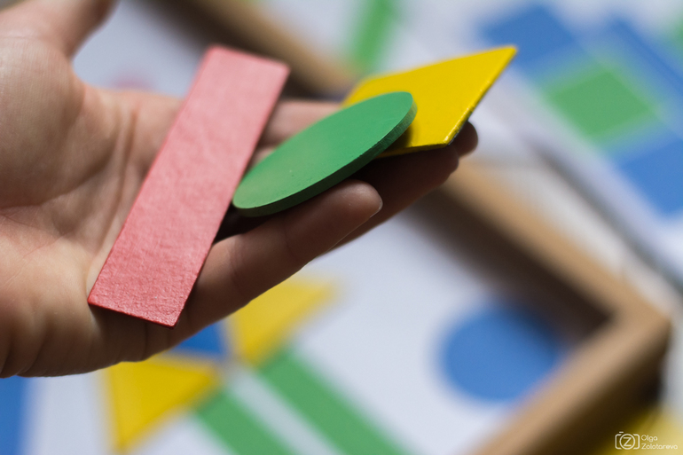 А на смену прикуплена и уже пару раз опробована игра схожего толка, но с большим разнообразием деталей и шаблонами в виде отдельной книжки, а это гораздо сложней. Это деревянный конструктор от Лесной фантазии, аналог Geoformes от Djeco.