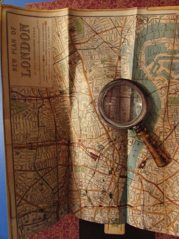 В кармашке лежит складная карта Лондона 19 века, на которой отмечены все места, где бывали Шерлок Холмс и доктор Уотсон. И плюс настоящая лупа!