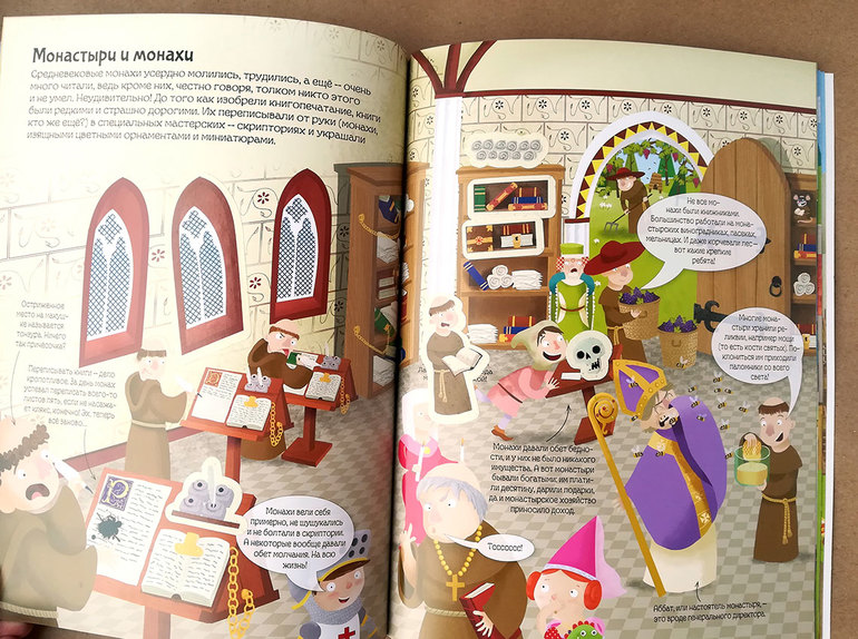Средневековье показано во всей красе. Несимпатичные персонажи, по большей части даже страшненькие. Грязь, чума, пытки, убийства, войны и прочие ужасы! И это практически на каждой странице! Просто хочется побыстрее закрыть, и больше никогда не открывать. Клеить мужиков, которые гоняются с топорами за собаками и закидывать человека в колодках гнилью как-то не хочется даже мне, а уж детям каково!