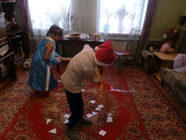 Я надеялась, что сестра мне нарисует бабулю, как снеговиков, но такое счастье не часто выпадает( Пришлось распечатать, наклеить на картон и раскрасить. Сначала сделали бабуле подарок, потом поиграли с вениками - не так-то легко бумажные фигуры замести, хотя я их и из картона вырезала. Потом отгадывали загадки, конечно, дети по инерции отвечали что не надо( Но потом все-таки отвечалаи правильно, только Дуремара не смогли вспомнить. потом пошли варить зелье. Баночки с ингредиентами конечно позабавили всех, сварили зелье, дети попробовали. Прочитали записку, правда никто не додумался посмотреть через зеркало, хотя мы такое задание делали недавно с Лидой. Нашли паутину, открыли ключиком замок, на входной двери нашли пазл, собрали его. В стиральной машинке были буквы, из них сложили слово "табуретка", потом играли уже без меня, мне надо было уйти. В общем, одежду они наизнанку носили, гадали, кусочек календаря нашли, все как положено, даже пару заданий еще выполнили. Ждем путешествия на фабрику новогодних игрушек!