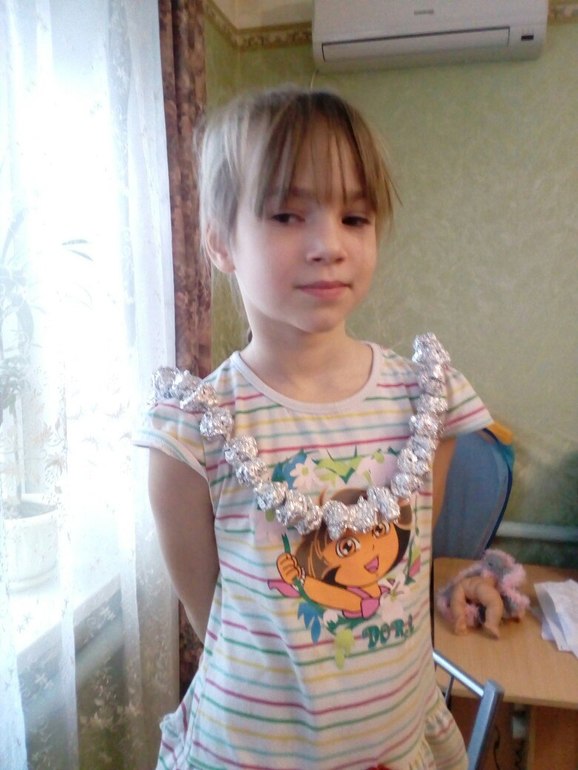Сегодня Лида была не очень в настроении, тем более она у нас приболела ( Мы отправились на фабрику новогодних игрушек, , познакомились там с директором, ответили на вопросы и решили кроссворд (Лида сама почти без моей помощи все написала, с каждым днем все лучше и лучше пишет!), потом сделали бусы из фольги (это ей тоже понравилось), потом посмотрели видео про елочные игрушки, сначала ей было очень интересно, сказала, что будет работать стеклодувом( но потом надоело. Я предложила ей раскрасить деревянные елочные игрушки, которые у нас уже давно леали, она их начала раскрашивать, потом надоело( И сейчас тоже ей раскрашивать не хотелось, хотелось какого-то экшена. Сказала, что у БабыЯги было веселее, но директор фабрики поспорил с Бабой Ягой, и это Лиду немного развеселило(( Потом выполняли задания - смешивали цвета, нашли хлопушку, подсказку в киндер-яйце и, наконец, сам календарь. Лиде было мало движения, чтобы ее успокоить, я ей подарила игрушечную плюшевую собачку.