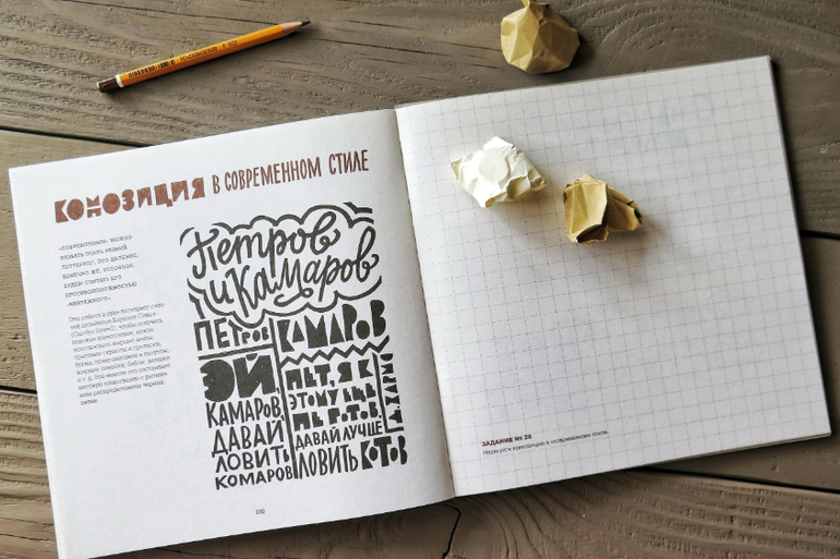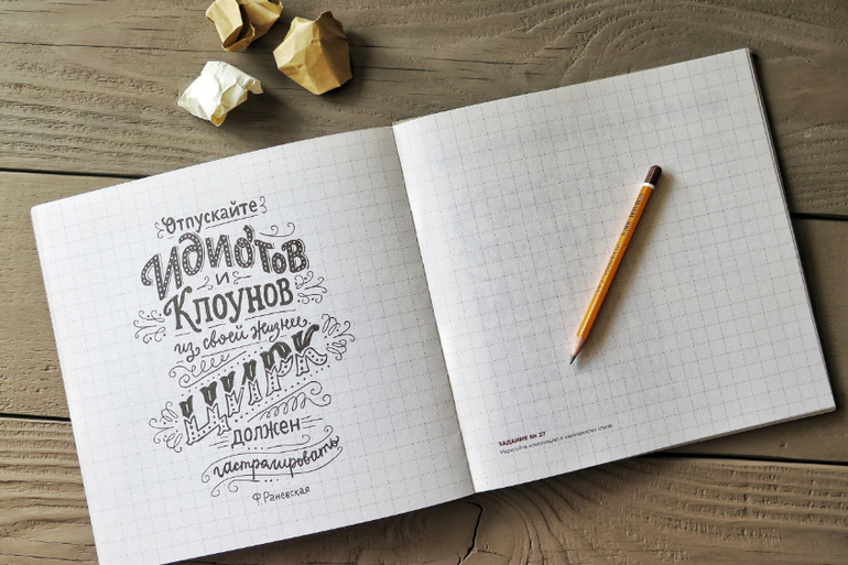 📝В книге есть специально отведенные странички для выполнения заданий. Всего 30 заданий, совершенно не сложных. Выполнив их можно будет создавать собственные леттеринги, со своими или не своими текстами. Кстати, в конце книги есть список умных мыслей из книг