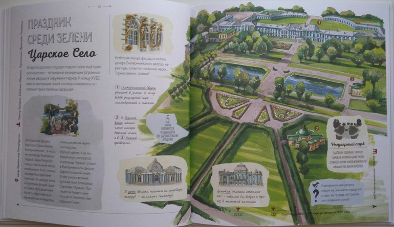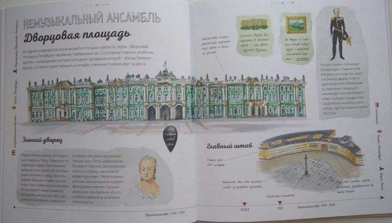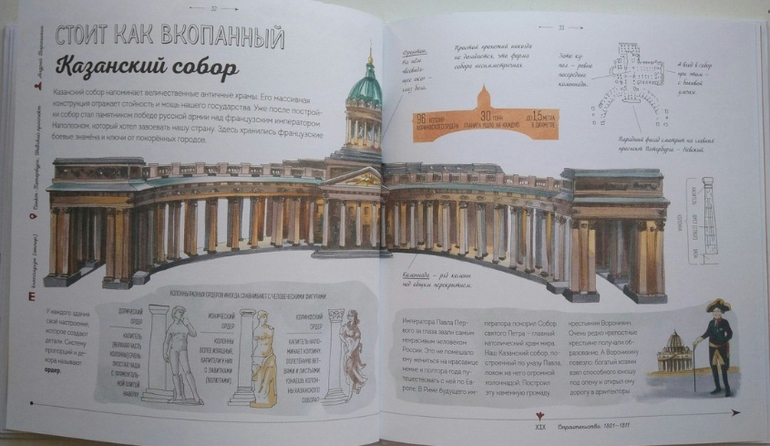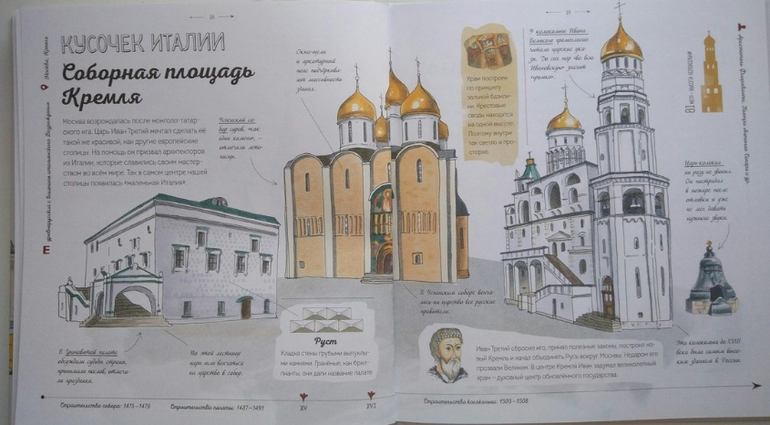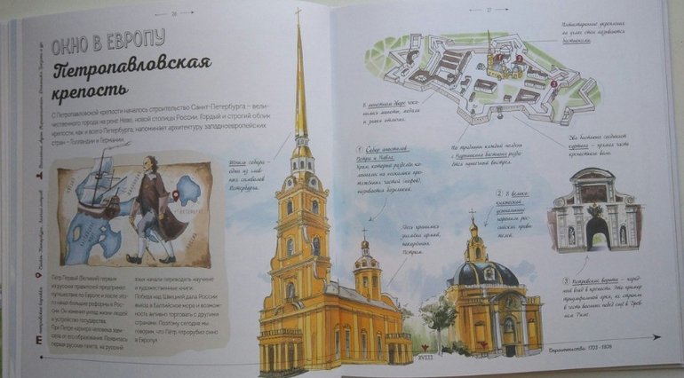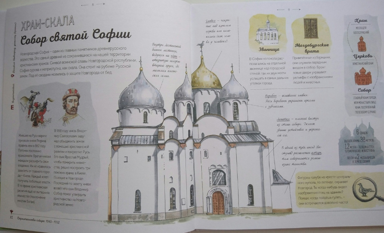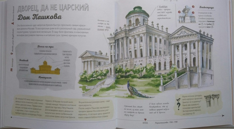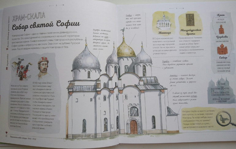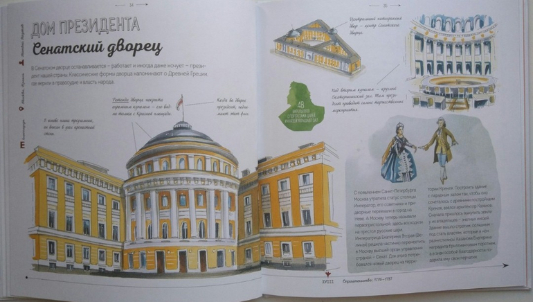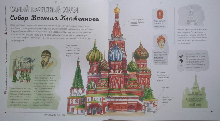 На одном развороте книги показана краткая история архитектуры. Далее в книге рассказывается о российских памятниках архитектуры: тут и описание наиболее интересных, необычных и исторически значимых архитектурных сооружений, и исторические справки, и основные архитектурные термины, и описание стилей. Славке зачитываю отдельные моменты, что-то объясняю своими словами. Очень радует то, с каким интересом мой малышочек слушает и задает вопросы. Я и сама очень много узнаю из этой книги, да и рассматривать акварельные рисунки - одно удовольствие! После прочтения книги появилось огромное желание попутешествовать по России и воочию увидеть описанные памятники архитектуры.